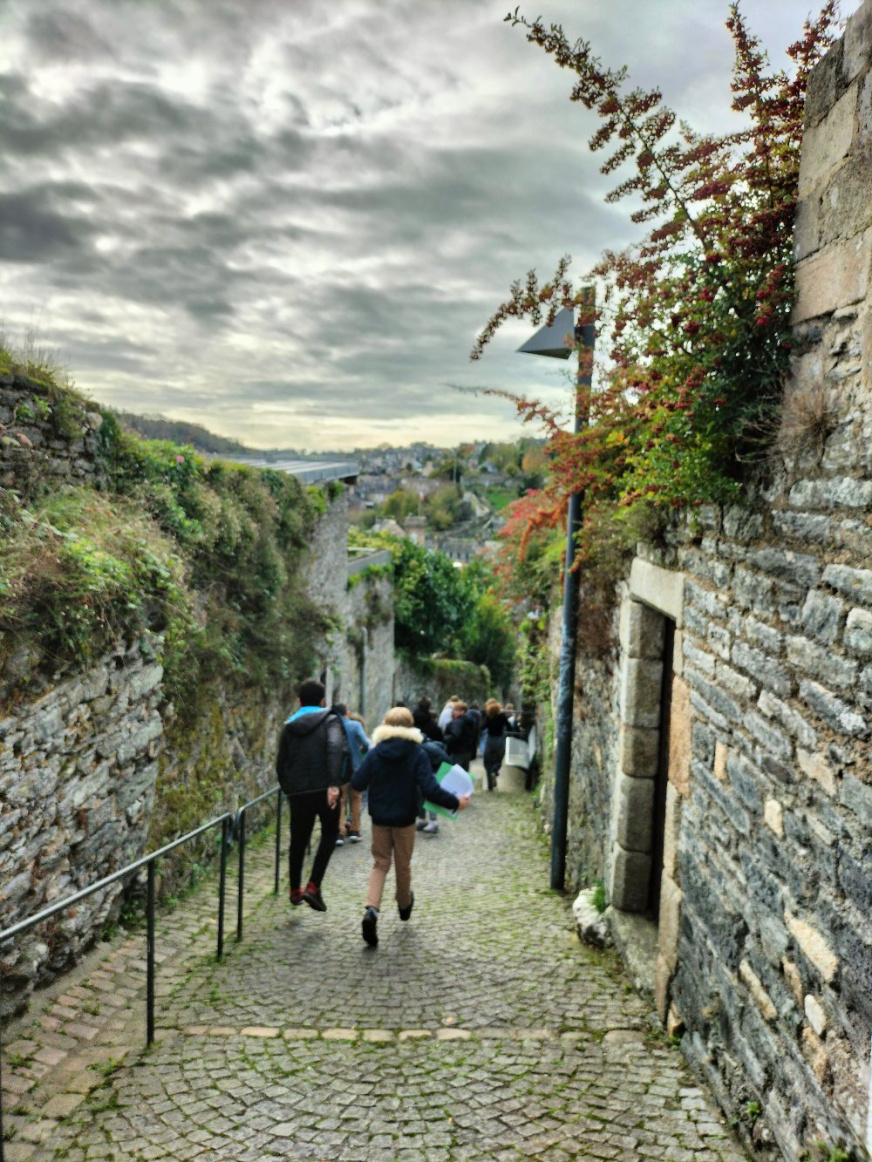 Morlaix était autrefois une ville-gué, elle permettait de passer d’un bord de la rivière à l’autre. Morlaix s’est toujours développée autour de l’eau, au creux de la vallée. Ses deux rivières se nomment, le Jarlot et le Queffleuth. Les habitants utilisaient les rivières pour les besoins quotidiens, pour faire le commerce des toiles de lin, pour faire tourner les moulins à papier et pour le lavage des peaux, des toiles ou des vêtements ! Petit à petit les rivières ont été recouvertes par des places, des rues et des parkings pour gagner de l’espace et parce que l’on pensait ainsi éviter les inondations. Les inondations n’ont pas cessé et aujourd’hui le projet est de réouvrir les rivières. Cette sortie nous a permis de voir Morlaix sous un angle nouveau et nous avons hâte de découvrir le nouveau visage de Morlaix ! Nolan, Joachim, Hugo et Mathys