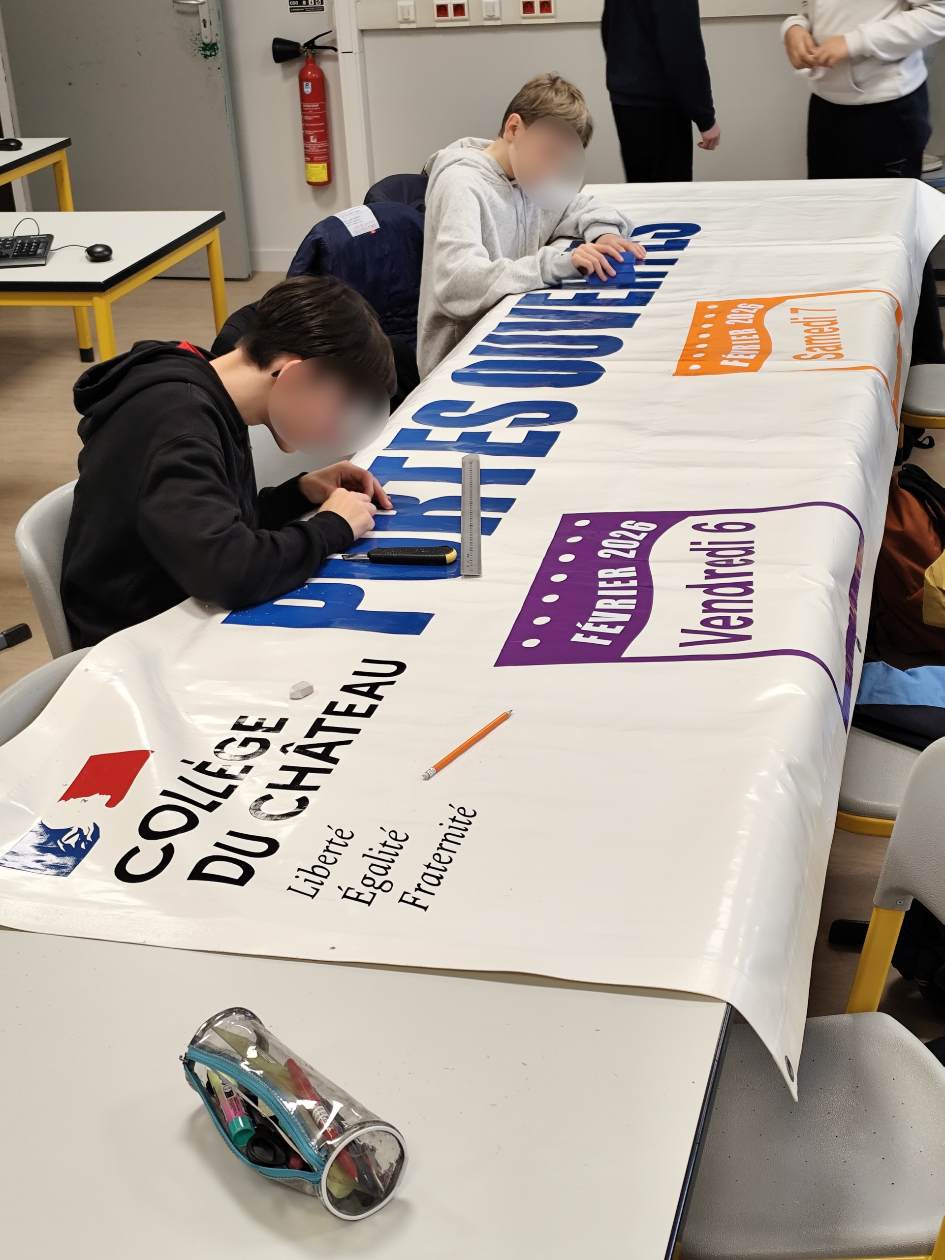 Quand des élèves de l’atelier Fablab du collège prépare la banderole pour les portes ouvertes de l’établissement. D’autres échangent avec M. LANDOUAR, notre agent de maintenace du collège pour compléter la signalétique du collège pour aider les personnes à se repérer.
